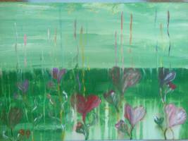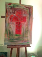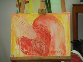 Ich gehe durch eine Tür zu Gottes Herzen. Nach vielen Herzschichten sehe ich einen weißen Mann an einem Schreibtisch, der uns in das Buch des Lebens einträgt. Jesus schaut ihm dabei zu. Der Vorhang fällt aus dem Bild heraus.